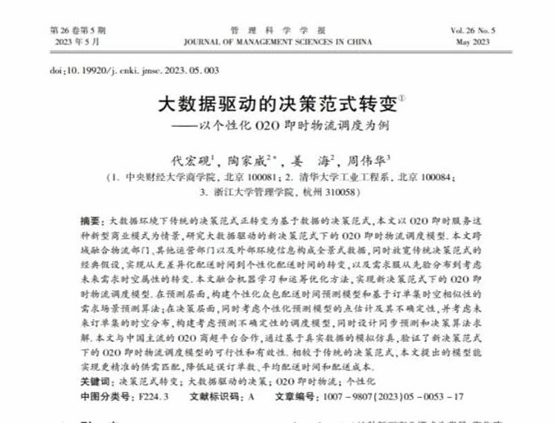 Professor Dai Hongyan from Our School Published an Academic Paper in the Authoritative Journal “Journal of Management Science in China” Recently, Professor Dai Hongyan from our School collaborated with Dr. Tao Jiawei from Tsinghua University, Professor Jiang Hai from Tsinghua University, and Professor Zhou Weihua from Zhejiang University to write the article "Paradigm shift for big data-drive...