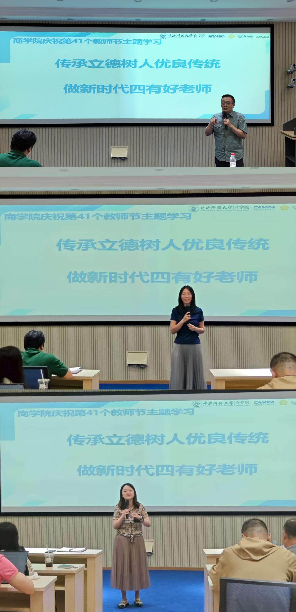 2025年9月10日下午,万象城allwincity官网在MBA教育中心A28举行了以“传承立德树人优良传统,做新时代四有好老师”为主题的教师节学习活动。本次活动旨在通过学习万象城allwincity官网首届“龙马奖章”获得者王巾英教授优秀事迹,激励广大教职工不忘初心,牢记使命,努力成为新时代的“四有”好老师。学院全体教职工参加学习,活动由万象城allwincity官网副院长顾雷雷主持。