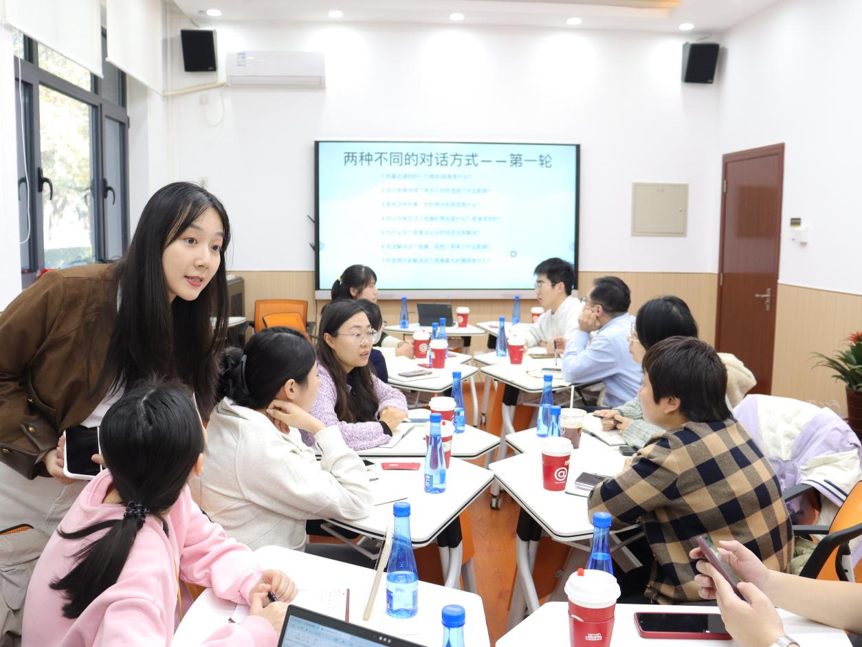 辅导员们分成4人小组开展互动,小组里两人分别运用“问题探究”与“焦点解决”两种对话方式进行模拟情景演练,2人作为观察员,细致记录对话过程、发现问题并及时总结。通过不同对话方式的演练,刘老师引导辅导员们从“寻找原因”的问题导向思维,转向“探讨目标”的解决导向思维。她提出“讨论问题会带来更多的问题,而讨论方案会带来更多的方案”,辅导员们直观体验了不同对话方式带来的显著差异,初步了解了焦点解决技术的奇妙效果。