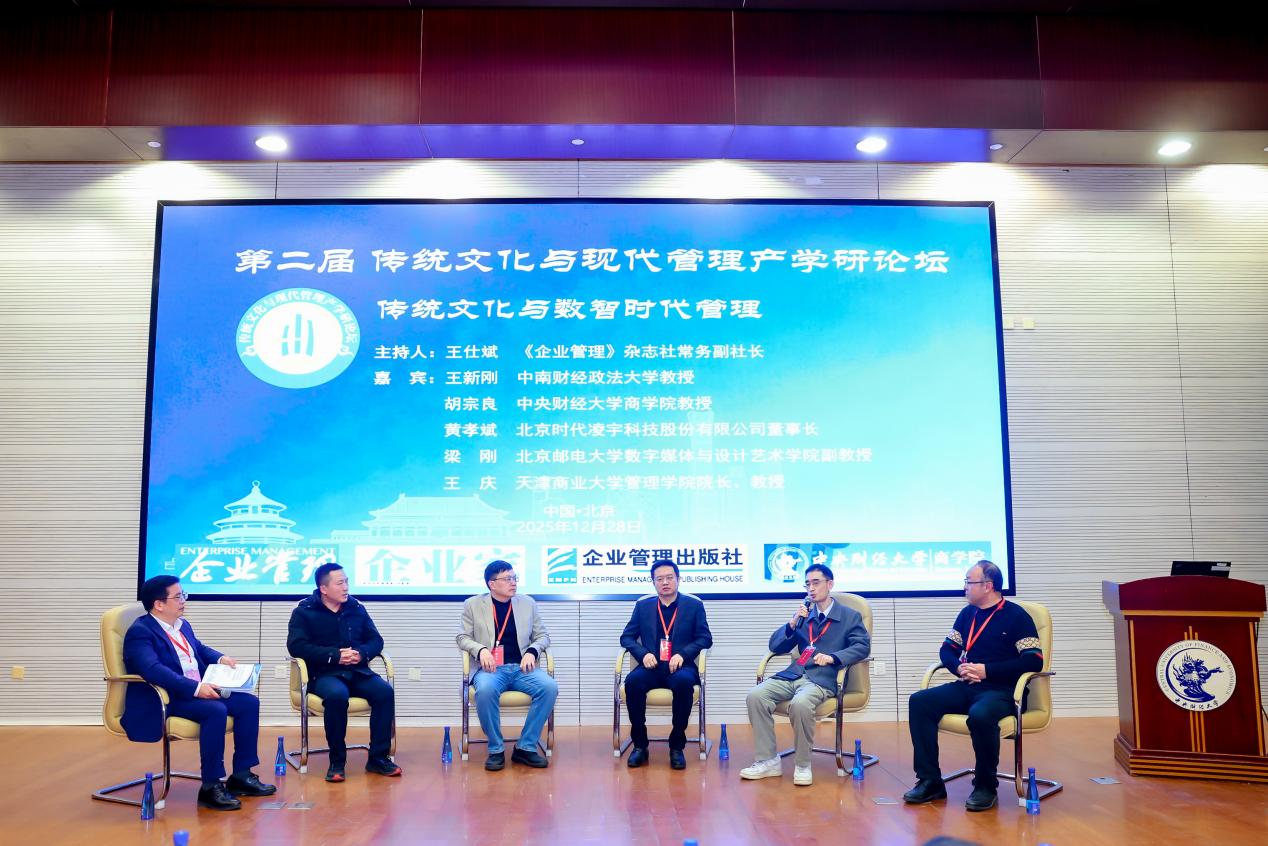圆桌讨论环节由《企业管理》杂志社常务副社长王仕斌主持,中南财经政法大学教授王新刚,万象城allwincity官网教授胡宗良,北京时代凌宇科技股份有限公司董事长黄孝斌,北京邮电大学数字媒体与设计艺术学院副教授梁刚,天津商业大学管理学院院长、教授王庆等嘉宾,围绕“数智化时代应坚守哪些传统价值观”“企业弘扬优秀传统文化的有效路径”等议题进行了深入研讨。