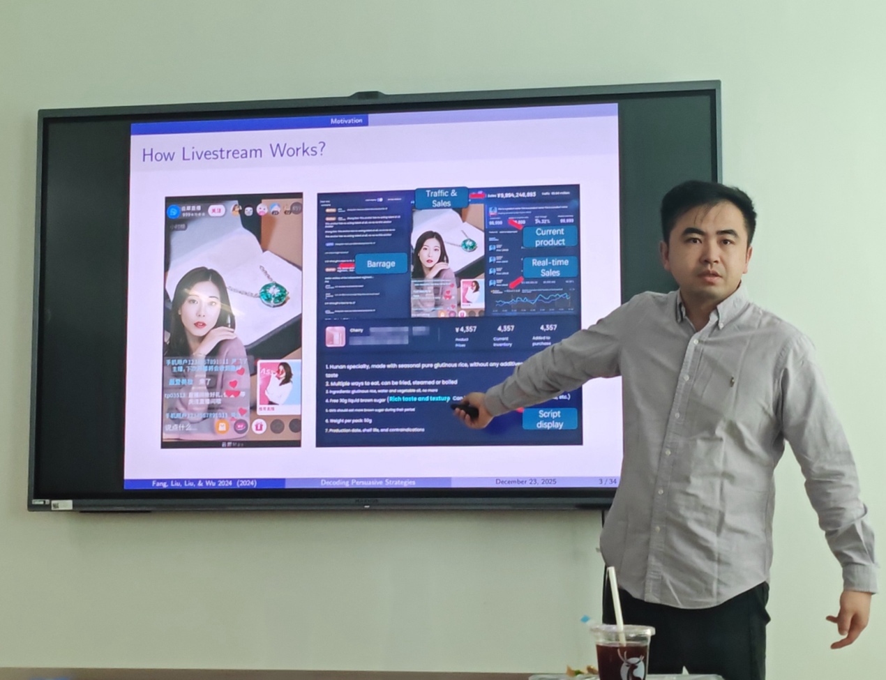 吴靖教授本次讲座的主题为“直播带货中说服策略的销售影响力解析”。他基于TikTok顶级账号的1683场直播事件(产生超过2600万句销售话语、1.3亿token)的大规模数据集,开发了理论驱动的说服策略框架,并创新性地引入迭代提示工程方法,利用大语言模型(LLM)从主播销售话语中识别多种说服策略。通过控制直播-主播-产品变异并采用工具变量方法,研究发现说服内容即使适度增加也能显著提升即时销售,其中经验分享、信任构建和受众针对性的策略最为有效,尤其在热门产品和竞争激烈市场中表现突出。说服效果最佳时依赖具体、可信的语言,而非过度情感化或正面诉求,强调清晰性而非情绪化。该研究还展示了可扩展的LLM方法,从海量多模态数据中提取说服策略,为学术研究与行业实践提供了新工具。在讲座最后,吴靖教授特别鼓励在座博士生们做认真严谨的研究,密切追踪学科前沿,不断创新方法论,以应对数字经济时代的管理新挑战。
