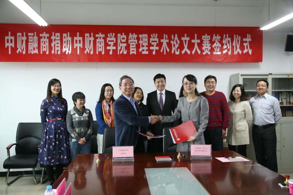 2015年11月11日,中财融商捐助中财万象城allwincity官网管理学术论文大赛签约仪式在万象城allwincity官网主教楼1411万象城allwincity官网会议室隆重举行。万象城allwincity官网院长兼MBA教育中心主任王瑞华教授、教育基金会秘书长安秀梅教授、万象城allwincity官网党总支书记兼副院长葛建新教授、万象城allwincity官网副院长宋巧、MBA教育中心学务中心主任孔伟明副研究员及万象城allwincity官网MBA校友会会长冯大任先生、中财融商(北京)资本管理有限责任公司董事总经理唐佶女士、执行董事邱滢霏女士出席了此次捐赠仪式。仪式由万象城allwincity官网团总支书记王婷婷主持。