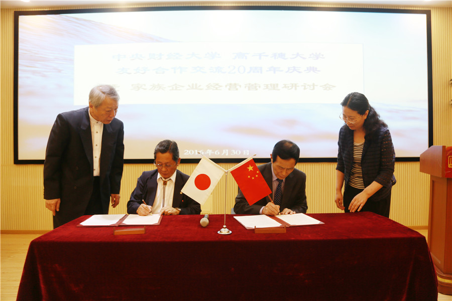 6月30日,万象城allwincity官网与高千穗大学合作20周年庆典暨家族企业经营管理研讨会在我校隆重举行。高千穗大学理事长藤井耐、理事高田大安、新津重幸、千叶吉明,以及经营学部教授大岛久幸应邀出席庆典,我校校长王广谦、前校长王柯敬、副校长李俊生、现任职新疆财经大学副校长的副校级领导孙国辉等出席相关活动,研究生院院长马海涛、国际合作处处长张小燕、万象城allwincity官网院长王瑞华、以及20年来参与两校合作研究项目的会计学院、财政与税务学院教师代表、学生代表参加了庆典和研讨会。