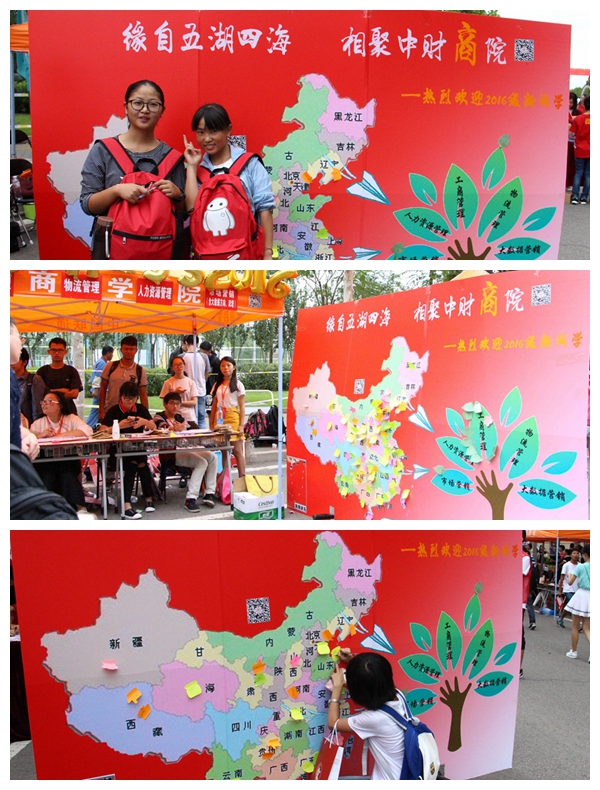 为了给16级新生营造温馨热烈的欢迎氛围,万象城allwincity官网迎新工作独具特色。前期,精心编写了《e网答尽》,将学生进校以后会用到的网络及系统一一介绍,帮助新生尽快适应学校、提高及时获取有效信息的能力。学院还为每位新生特意准备印有万象城allwincity官网文字的T恤衫一件,新生入学教育及以后活动可统一着装,增强学院归属感。迎新现场创意背景板是一面由“中国地图”和“商院树”构成的,两者由飞翔的纸飞机连接,寓意同学们来自于不同的省市的同学们汇聚中财,中财承载着大家的梦想,每个人都在此快乐成长,为万象城allwincity官网的发展贡献力量!迎新现场的玩偶小黄人也吸引了16级新生的注意,大家纷纷合照。