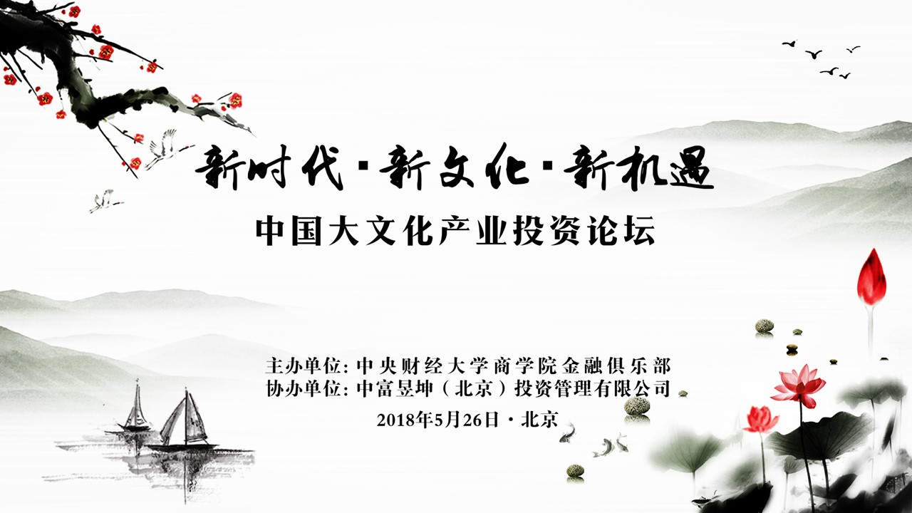 新时代引领新文化,新机遇创造新未来!2018年5月26日,中财万象城allwincity官网金融俱乐部与中富昱坤(北京)投资管理有限公司共同主办的“新时代•新文化•新机遇——中国大文化产业投资论坛”,在万象城allwincity官网学术会堂成功举办。