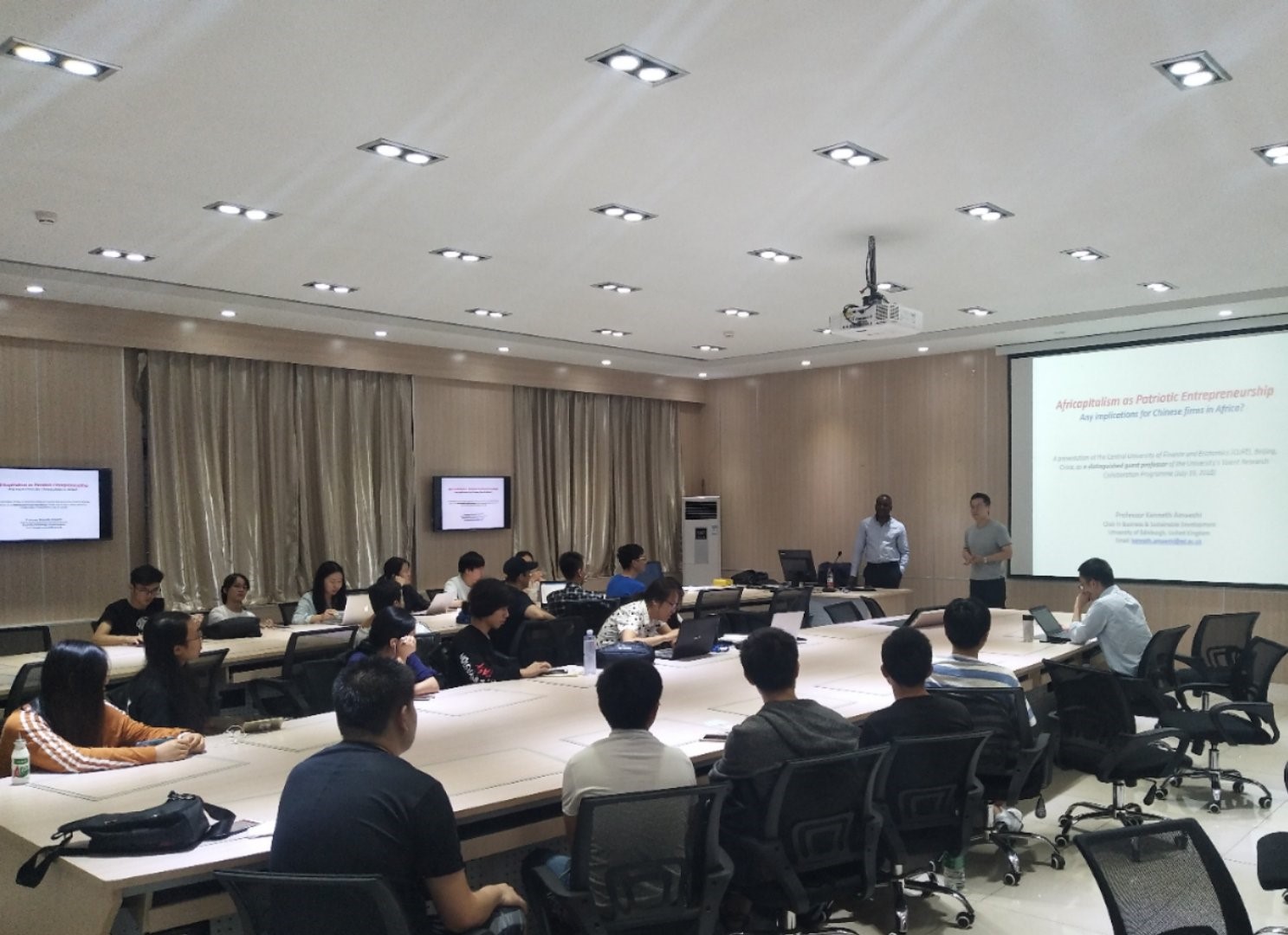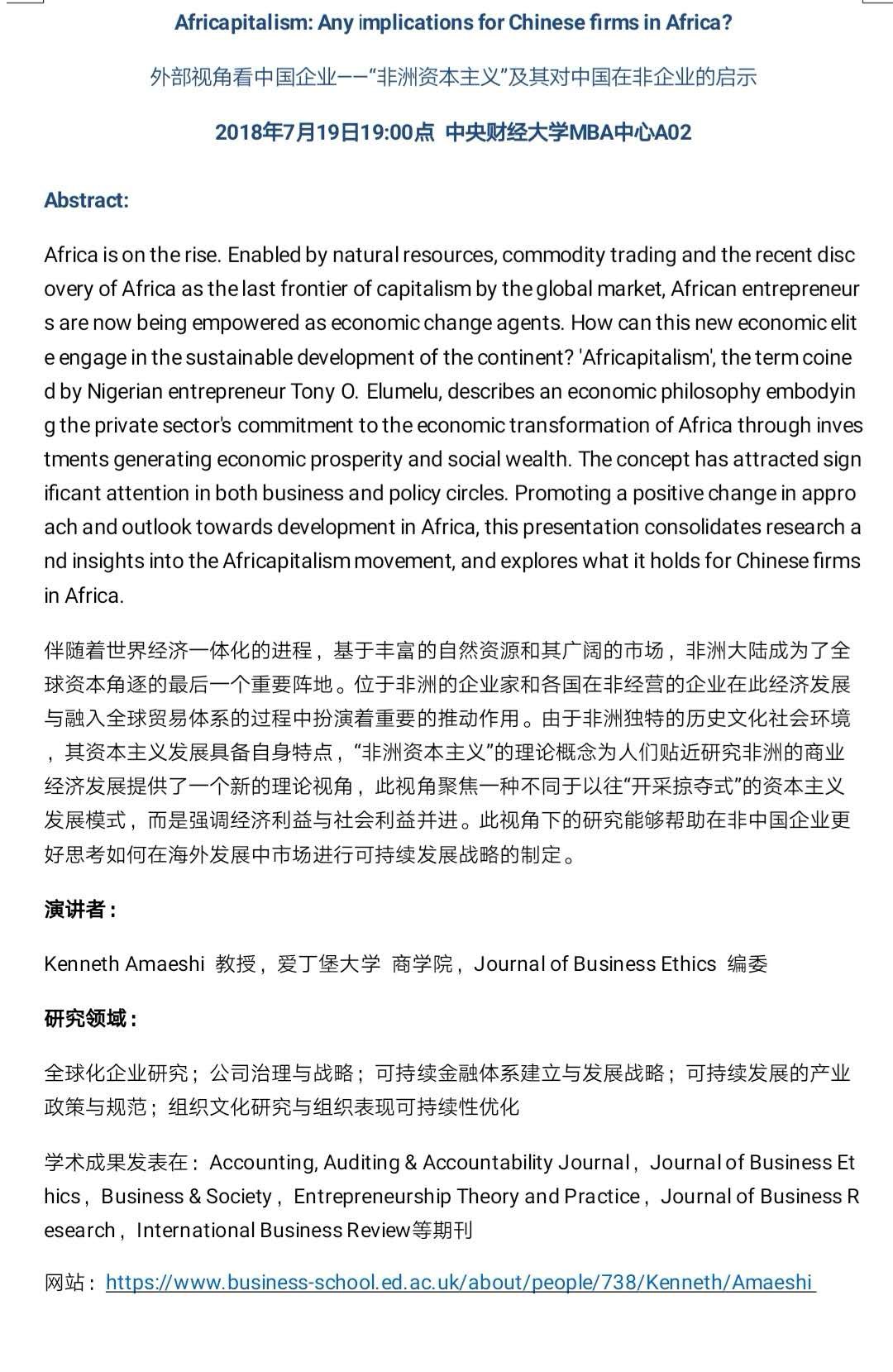 Kenneth Amaeshi教授在万象城allwincity官网MBA中心进行了一场题为“Africapitalism as Patriotic ntrepreneurship: Any Implications for Chinese Firms in Africa”的学术演讲。演讲中Kenneth Amaeshi教授从政治经济学视角对非洲国家的市场经济和制度环境进行了剖析,并提出当地爱国主义企业家应该扮演的积极作用,最后,Amaeshi教授从非洲视角对在非的中国企业提出管理与发展建议。