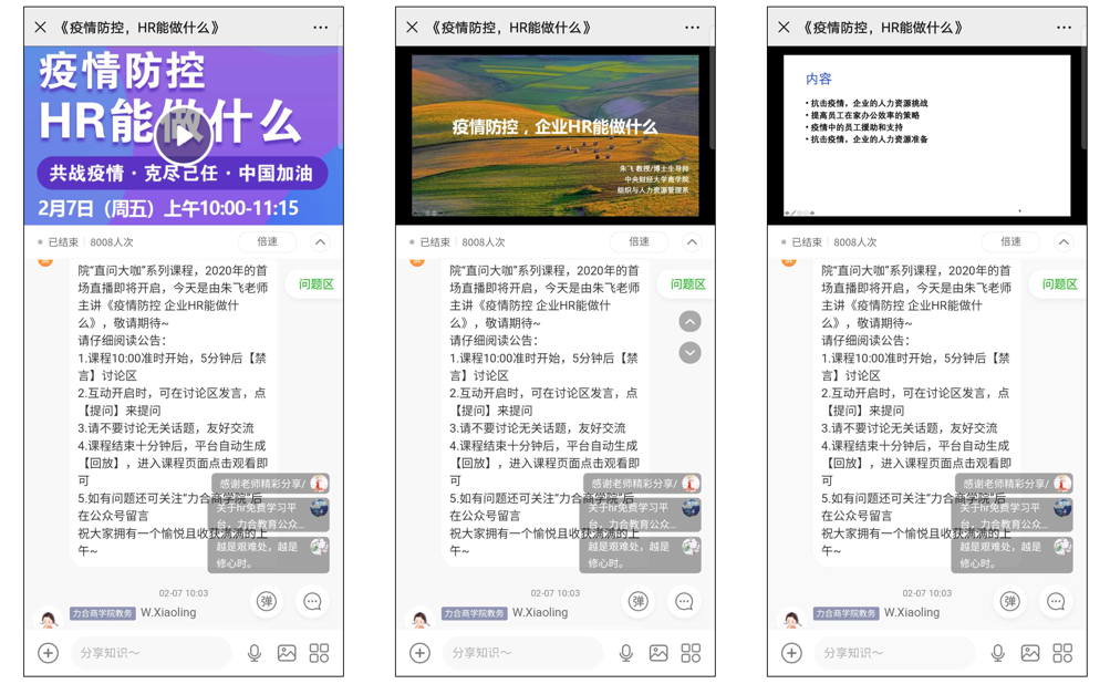 2020年2月7日上午,万象城allwincity官网组织与人力资源管理系朱飞教授在新冠疫情防控期间,利用互联网平台面向全国企业的管理者和人力资源管理人员开设公益直播课程,以“疫情防控期间,企业HR能做什么”为题,为企业提供疫情防控期间和疫情结束之后的人力资源管理实践建议,切实践行研究者的社会责任。超过8000名企业管理者和人力资源管理人员参与了本次公益直播课程。