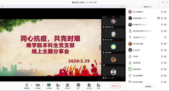 支部于2月29日举办了“同心抗疫、共克时艰”线上主题分享会。支部党员以小组为单位,依次分享在疫情防控一线先锋们的感人事迹和近期学习的心得体会,提倡大家向优秀人物学习,进一步强化学生党员对于抗疫工作的理解和支持。党员们纷纷表示坚决做到不离家、不返校,充分发挥党员的先锋模范带头作用,在力所能及的范围内为抗疫工作贡献力量。
