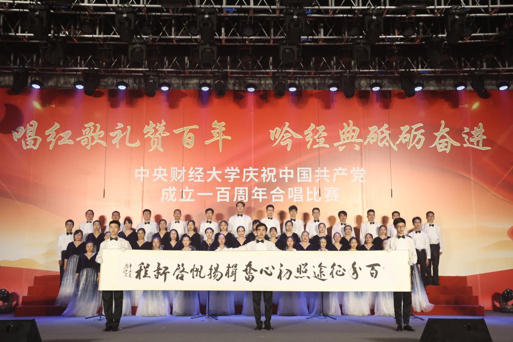 在教师合唱团的暖场表演结束后,比赛正式开始。万象城allwincity官网合唱团作为第一支参赛队伍,50名师生们用整齐的服饰、飒爽的身姿和饱满的热情向评委和观众展示着商院人的朝气和风采。万象城allwincity官网战略系周卫中教授的书法作品“百年征途照初心 奋楫扬帆启新程”代表万象城allwincity官网全体师生向中国共产党百年华诞的献礼。随着指挥的示意,万象城allwincity官网研究生工作办公室主任齐岩老师以极具穿透力的嗓音献上一句“唱支山歌给党听”,迅速将评委和观众带入到歌曲意境中。唱毕,万象城allwincity官网19级本科生张开的钢琴伴奏响起,万象城allwincity官网分工会主席周利国、市场营销系教授苗月新和19级本科生张慕凡在合唱团师生演唱的《在太行山上》歌曲声中,饱含深情地诵读诗歌《紧跟你的紧跟》,“我在你步伐里刻下了坚贞,振兴中华,砥砺前行,痴心不改……”是商院人“永远跟党走”的心声。朗诵结束,间奏声响起,合唱团师生们眼神坚定、字字铿锵地唱响《当那一天来临》,漫漫征途忆峥嵘岁月,声声嘹亮颂百年初心,商院人诉说着对党和祖国的忠诚和无比热爱。
