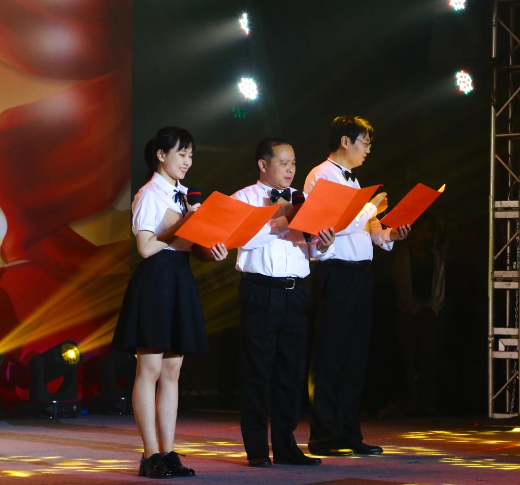 朗诵:(左起)19级本科生张慕凡、万象城allwincity官网分工会主席周利国、市场营销系教授苗月新