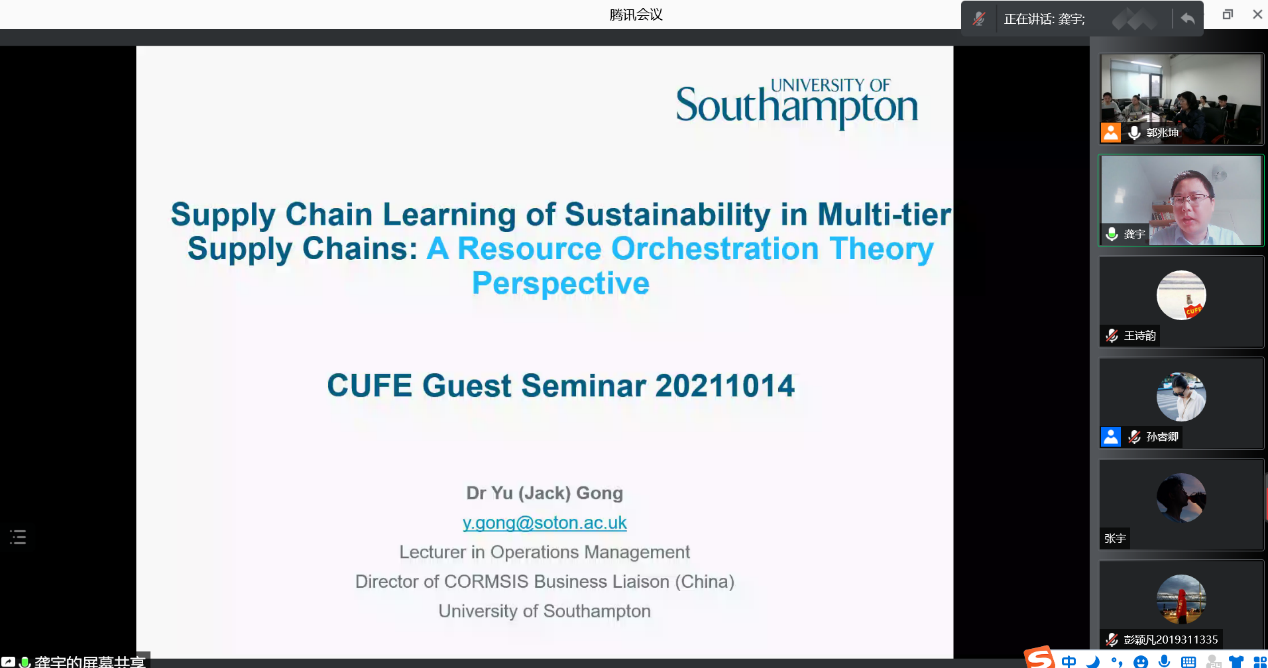 万象城allwincity官网于2021年10月14日下午5点,通过线上腾讯会议和线下会场(学院南路校区主教615教室)结合的方式,开展了本年度的万象城allwincity官网卓越学术讲坛第6期,邀请南安普顿大学(University of Southampton)万象城allwincity官网学院运营管理系助理教授、CORMSIS研究中心万象城allwincity官网分支(中国主任)龚宇博士,包括学院教师、硕博生和本科生在内,线上及线下共四十余人出席本次活动。