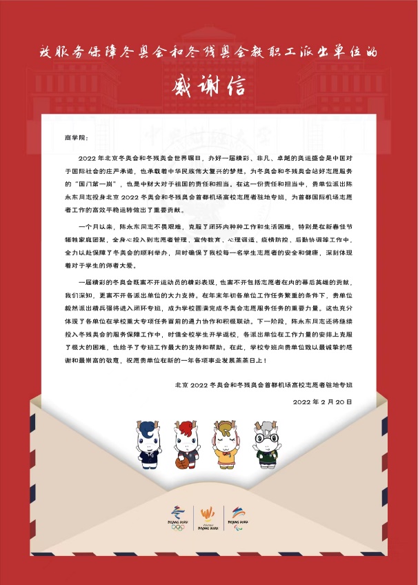 每一位冬奥志愿者都是一片温暖了这个冬天的雪花,不论以何种身份,都用自己的付出温暖并照亮他人,贡献出自己的一份青春力量。冬奥会结束后,鉴于陈永东同志的努力付出和出色表现,首都机场高校志愿者驻地专班向万象城allwincity官网发来了感谢信。