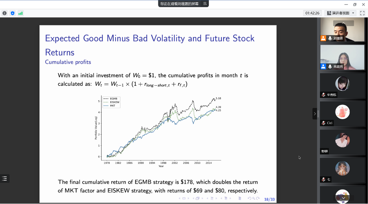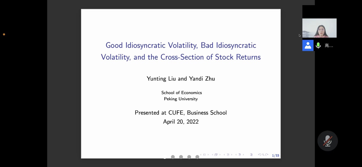 刘蕴霆博士本次讲座的主题为“Good Idiosyncratic Volatility, Bad Idiosyncratic Volatility, and the Cross-Section of Stock Returns”,本次研究将股票收益的特异性波动率分解为“好”和“坏”的波动率成分:好的波动率与正向收益相关,坏的波动率和负向收益相关。研究发现,与预期特异性偏度相比,预期好的减去坏的波动率不仅更准确地衡量了条件特异性偏度,而且还产生了更强的收益预测性。此外,区分好的和坏的波动性为解释背后的经济学机制提供了新的证据,增长期权之所以能获得较低的回报,主要是因为它们预测了正的特异性偏度,而这个特征对投资者有吸引力。