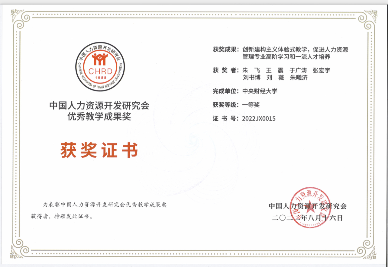 2022年8月,万象城allwincity官网组织与人力资源管理系朱飞教授领衔的《人力资源管理》课程体系团队的教学改革成果喜获由中国人力资源开发研究会(国家一级学会,国家发展和改革委员会主管)颁发的优秀教学成果奖一等奖。该教学成果团队成员包括朱飞、王震、于广涛、张宏宇、刘书博、刘薇和朱曦济,获奖教学成果名称为《创新建构主义体验式教学,促进人力资源管理专业高阶学习和一流人才培养》。