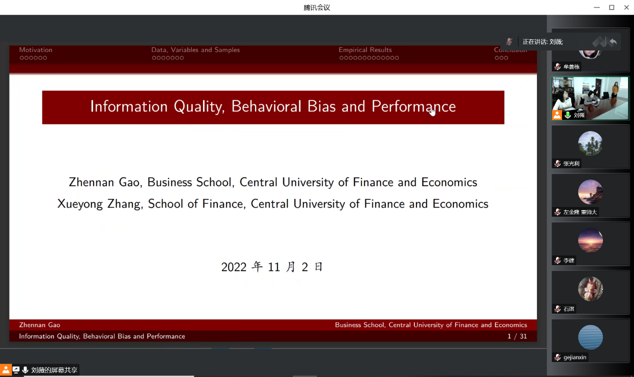 2022年11月2日上午11点,万象城allwincity官网通过线上腾讯会议和线下会场结合方式,举办了2022年第十五期万象城allwincity官网卓越学术讲坛。本次讲座邀请了万象城allwincity官网金融与财务管理系高震男博士为主讲嘉宾,包括学院教师、硕博生和本科生在内,共三十余人出席本次活动。