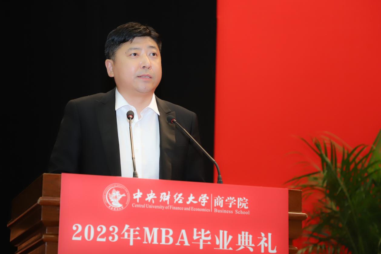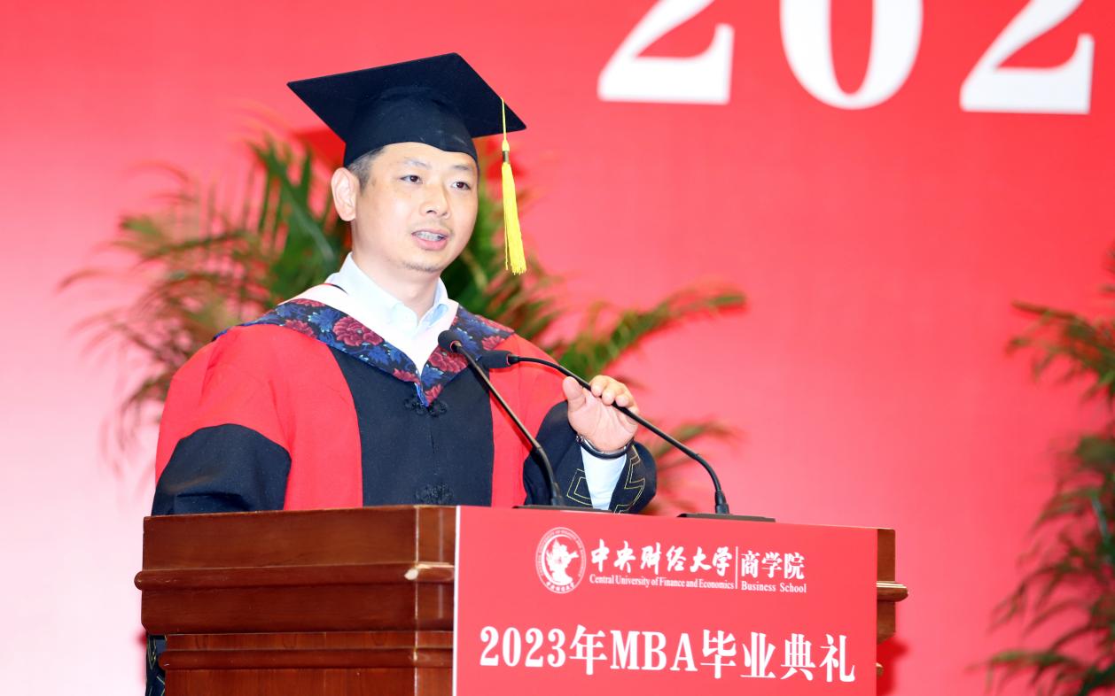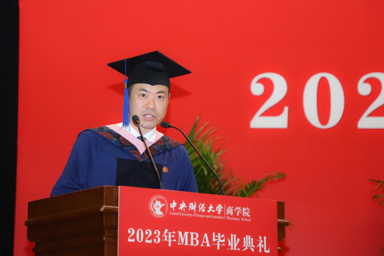 MBA任课教师于晓东作为教师代表发言,并向毕业生们献上真诚的祝福。他表示,非常高兴能代表学院全体MBA授课教师参加同学们的毕业典礼,见证大家毕业的喜悦,祝贺大家满满的收获,展望每个人美好的未来。他谈到,毕业为大家穿梭于工作岗位和学校课堂之间的辛劳和周折画上句号,也为大家开启了更高学位之下新阶段的开始和更高的目标与未来。于老师基于万象城allwincity官网的“商”字 的架构,将对大家的期望与祝福也浓缩在一个“商”字中。“商”的上半部分的“立”,于老师引用《左传》里的“太上有立德,其次有立功,其次有立‘’,期望大家在今后的工作中和生活中,从立德到立功再到立言,都不能放松对自己的要求。“商”字的下半部分“冏”,于老师赋予了炯炯有神和代表光明的内涵,以此祝愿广大毕业生前景光明,祝愿我们的国家拥有光明的未来。