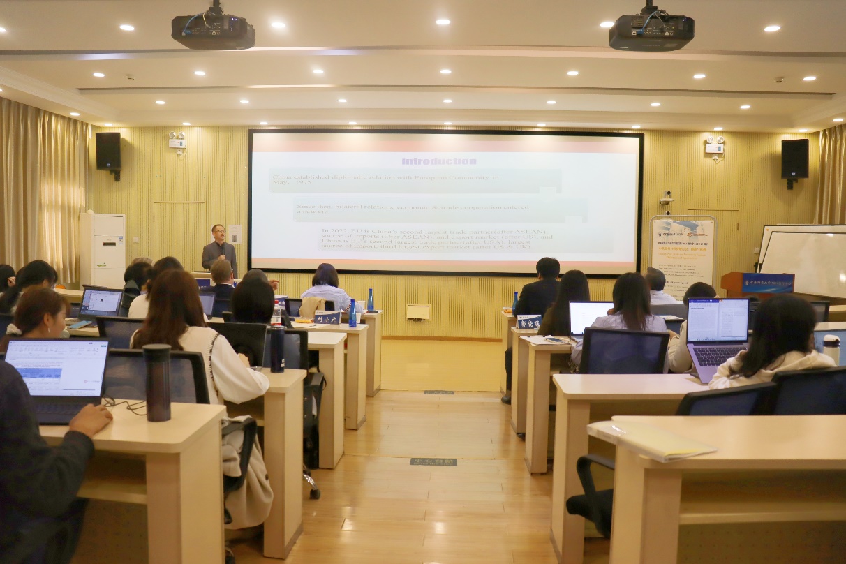国际合作处处长葛建新教授致辞。葛处长回顾了万象城allwincity官网与英德杰国际管理公司长达21年的合作历程,对英德杰国际管理公司及Peter Anterist教授表示衷心感谢。葛处长表示,本次研讨会为大家提供了宝贵的学习和思考机会,让我们能够对中欧贸易和投资的现状、挑战和机遇具有更深入的理解。