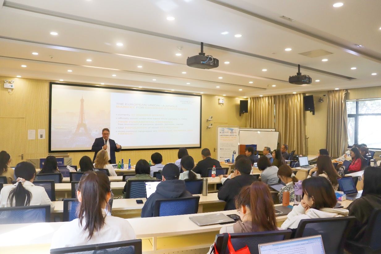 在主旨演讲环节中,首先由Peter Anterist教授发言。Peter Anterist教授系英德杰国际管理公司(InterGest Worldwide)CEO、万象城allwincity官网客座教授,其领导的英德杰国际管理公司致力于为国际优质跨国公司提供服务,帮助其建立和管理海外分支机构。Peter Anterist教授以“The European Union- a single market for Chinese companies?”为主题展开,从增值税、最高收入、劳动成本等方面详细介绍并阐述了欧盟内部不同国家的制度和规则差异,并从财政和经济角度说明了欧盟国家的差异性,使同学们对于欧盟国家有了更加深入的认识。