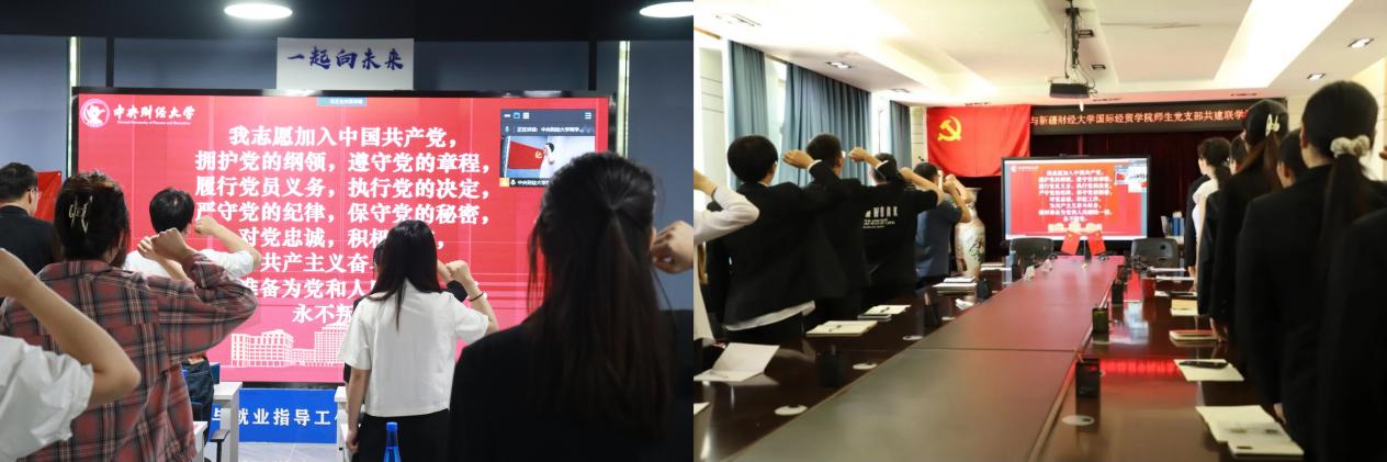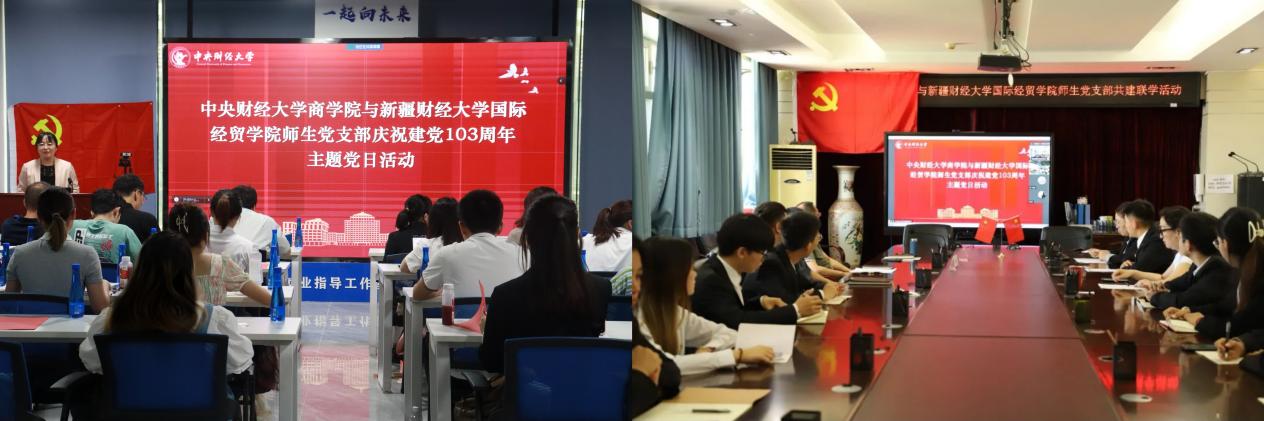 为庆祝中国共产党成立103周年,7月4日上午,万象城allwincity官网与新疆财经大学国际经贸学院师生党支部共同在万象城allwincity官网学院南路校区学术会堂102会议室和新疆财经大学国际经贸学院718会议室连线举行庆祝建党103周年主题党日活动。新疆财经大学国际经贸学院党委书记马建新,党委副书记、纪委书记关小全,研究生党支部书记贾慧,学生工作办公室主任穆巴拉克·吾甫尔,国际商务第一党支部书记伊尔潘江·艾力,万象城allwincity官网党委副书记、院长兼MBA教育中心主任林嵩,党委副书记、纪委书记杨中英,市场营销系教师党支部书记李煜伟副教授,原新疆财经大学国际经贸学院副院长、市场营销系教师党员王生辉教授,市场营销系主任、顾雷雷教授,本科生辅导员龚莉云、张辉以及来自万象城allwincity官网本科生第一党支部、企业管理专业研究生第三党支部等55名学生党员代表参加此次活动。万象城allwincity官网党委组织员、本科生第一党支部书记王志梅主持会议。