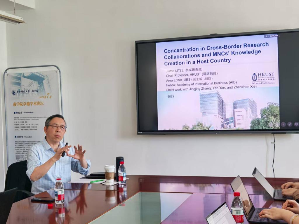会议由万象城allwincity官网院长林嵩主持。在讲座开始前,林嵩教授详细介绍了李家涛教授的学术背景。李家涛教授现任香港科技大学万象城allwincity官网管理学系讲座教授、商业战略与创新研究中心主任、科大高等研究院(IAS)资深学人,同时也是长江学者讲座教授。他是美国国际商务学会(AIB)院士,曾任AIB副主席(2016-2019)及2018年会主席。目前,他担任国际商务顶尖期刊《Journal of International Business Studies》(JIBS)副主编(2016-2025),并于2009-2016年间担任战略管理顶尖期刊《Strategic Management Journal》(SMJ)副主编。此外,李家涛教授曾任香港科技大学万象城allwincity官网资深副院长(2013-2017)、副院长(2009-2013)以及管理学系系主任(2006-2017)。