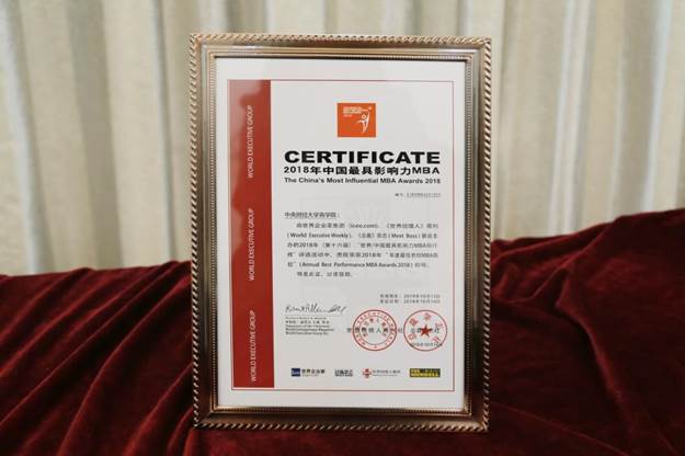 On October 30, 2018, the China MBA Summit and Award Ceremony wereheld by iCEO.COM andMeet Bossin Beijing, during which the list ofwinners for the 16th China’s Most Influential MBA Awards 2018 was released. TheBusiness School of Central University of Finance and Economics (CUFE) won theAnnual Best Performance MBA Awards 2018 fromWorld Entrepreneur.