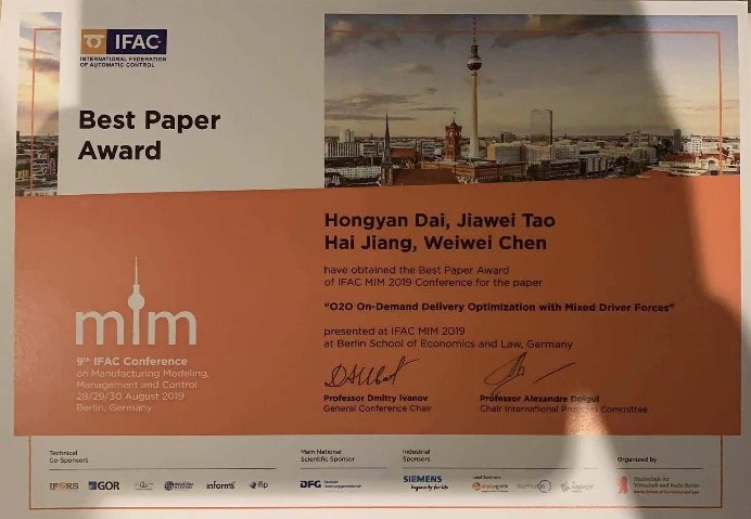 Among the 139 papers submitted, Professor Dai Hongyan’s paperwas awarded the Best Paper Award by MIM 2019, which is the highest award forthe conference.