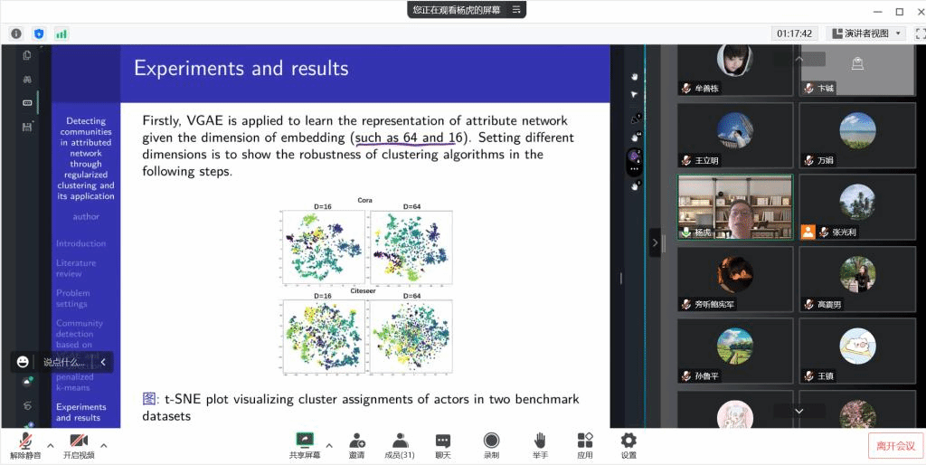 The topic of associate professor Yang Hu’s lecture is “Detecting Communities in the Attributed Network through Regularized Clustering and Its Application”. This research proposes a learning framework for community discovery in complex social networks, which effectively addresses the challenges and technical difficulties in the selection of network embedding dimensions and the determination of the number of communities. This framework can automatically determine the number of embedding dimensions and the number of communities by optimizing the regularized K-means. Besides, this research also provides algorithms and statistical proofs, which have been applied to the analysis of China's investment network data, confirming the effectiveness of this method.