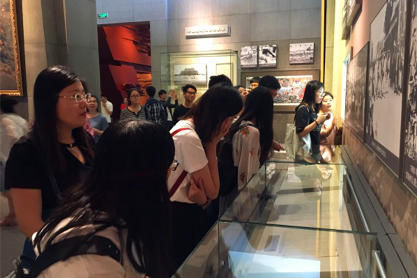 沿着历史的脉络一路参观,一幅幅图片,一张张图表,一件件实物,一段段视频,把入党积极分子带回了近代以来跌宕起伏、波澜壮阔的难忘岁月。19世纪末列强虎视眈眈、瓜分中国的时局图提醒着参观者牢记那段屈辱苦难的岁月;鸦片战争的虎门大炮、甲午海战的军舰模型、太平天国义和团的战斗旗帜彰显了中国社会各阶层的奋起反抗;洋务运动的蒸汽纺织机、维新变法的公车上书,象征着中国人民对救亡图存之路的孜孜求索;轰轰烈烈的辛亥革命推翻了清政府的统治,五四运动翻开了新民主主义革命的篇章。