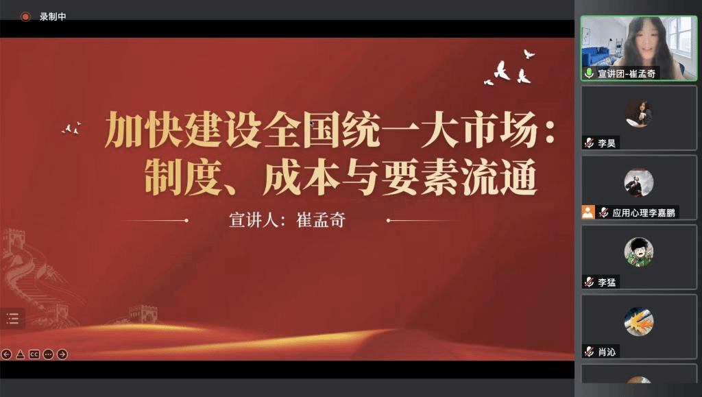 2022年5月19日,万象城allwincity官网技术经济及管理专业研究生党支部邀请中国财政发展协同创新中心2021级博士生崔孟齐进行题为“加快建设全国统一大市场:制度、成本与要素流通”的主题宣讲。此活动是我校博士生宣讲团以习近平新时代中国特色社会主义思想为指导,围绕党的创新理论、党史国史、国家战略、发展成就、形势政策等方向开展的“1+3+N”宣讲计划中的主要组成部分。